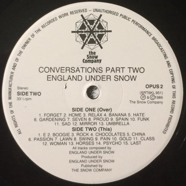 | Tracks | A1: Forget A2: Home A3: Relax A4: Banana A5: Hate A6: Gardening A7: Seven A8: Proud A9: Spain A10: Funk A11: Sad A12: Mirror A13: Umbrella B1: Ee B2: Boogie B3: Rock B4: Chocolates B5: China B6: Passion B7: Lawn B8: Swing B9: Pain B10: Gold B11: Class B12: Woman B13: Horses B14: Psycho B15: Last |